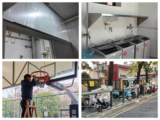 焕新公寓,添置设施,在校生活更省心。在设施完善方面,天管办聚焦师生所需,对学生公寓墙面、吊顶及卫生间等老旧设施进行维护修缮,实施并完成南苑一栋淋浴房隔断加高工程,增设南苑开水房脏衣架及开水架、西门人行道电动自行车充电位等便民生活设施,有序做好体育器材、快递柜等设施维护工作,以点滴细节提升师生幸福感。