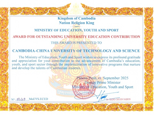 “杰出大学教育贡献奖”由柬埔寨副首相兼教育、青年和体育部大臣韩春那洛签批并颁发,旨在表彰为柬埔寨人才培养与教育事业发展作出卓越贡献的个人(团队)或机构。