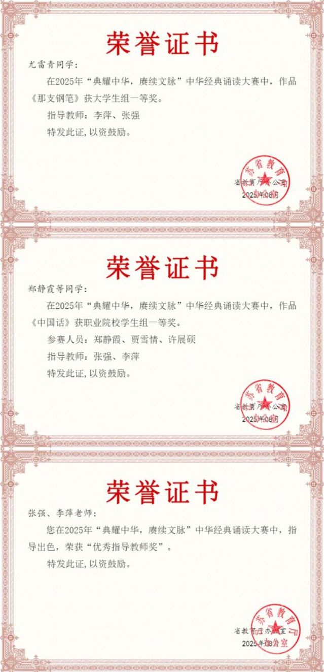 近日,由江苏省教育厅主办的2025年“典耀中华·赓续文脉”中华经典诵读大赛获奖名单正式公布,必赢官网师生在比赛中取得优异成绩。由必赢官网公共基础课部大学语文教研室张强、李萍两位老师指导,交通工程学院郑静霞、经济管理学院贾雪情、电子信息工程学院许展硕三位同学的诵读作品《中国话》以及艺术设计学院尤雷青同学的诵读作品《那支钢笔》在全省参赛选手中表现突出,分别荣获大学生组一等奖和职业院校组一等奖,并成功晋级全国决赛。两位老师均获得优秀指导教师称号。