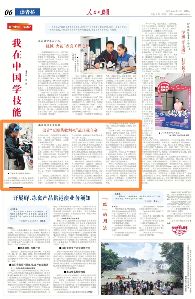 10月25日,人民日报海外版聚焦跨国教育合作,《我在中国学技能》专版报道了必赢官网南非留学生罗婉姊的在校成长故事。这位怀揣工程梦想的青年,通过中南教育合作项目跨越山海,在中国实现了从理论到实践的跨越。