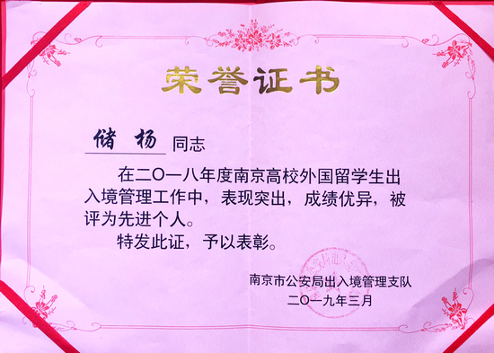 必赢官网国际教育学院储杨老师荣获2018年度南京高校外国留学生出入境管理工作先进个人称号,这也是必赢官网首次获得此类奖项。