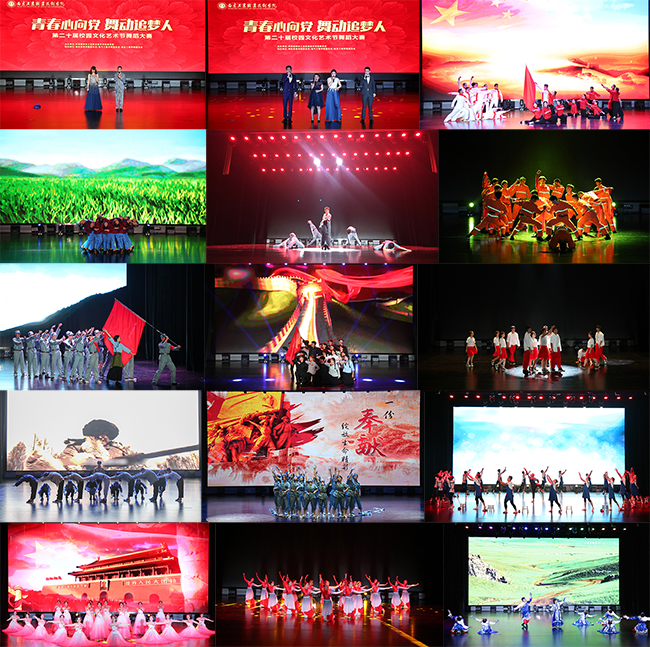 此次大赛以歌曲《赞赞新时代》开场。机械工程学院《红旗颂》展现了革命青年在红旗的指引下英勇战斗、奋勇前进,将红旗扛在肩上, 他们的足迹记载了无尽的艰辛。电气工程学院《我的母亲》描绘了一位母亲在母爱的力量下,收养孤儿,靠自己的双手将孤女抚养长大。《英雄赞歌》为我们展现的不一样的青春年华。航空工程学院《逆行者》消防员们的背影让人震撼,他们无畏的救援精神让我们感动,值得我们尊敬。交通工程学院《红色记忆》红歌声声,召唤着尘封的红色记忆;红舞翩翩,引领着奋进的努力方向,他们用舞蹈向我们展现了红军前辈们的宝贵精神。计算机与软件学院《田间斗笠》用舞蹈描绘了志愿者们扎根中国大地、抒写青春华章。《南京·殇》用身体语言再现历史,呼吁大家珍惜和平,不再让这样的历史重演。经济管理学院《希望》为我们描述了一群追逐梦想、即使跌倒也永不言弃的青年人。《最后的名单》让我们知道了当初抗日的艰难和我们中国人民不畏生死,一心卫国的精神。商务贸易学院带来的舞蹈《彼岸》、《匠心》体现了红军战士们永垂不朽、坚强不屈的革命精神,他们的精神值得我们后辈们永远铭记。艺术设计学院《我和我的祖国》展现了我们在自己的时代里以青春之名,为祖国起舞。《灼灼芳华》舞出了一段平凡却又终生难忘的青春足迹。国际教育学院《那达慕》用欢快的舞蹈展现了蒙古的人们为了庆祝丰收而举行的盛大的集会。