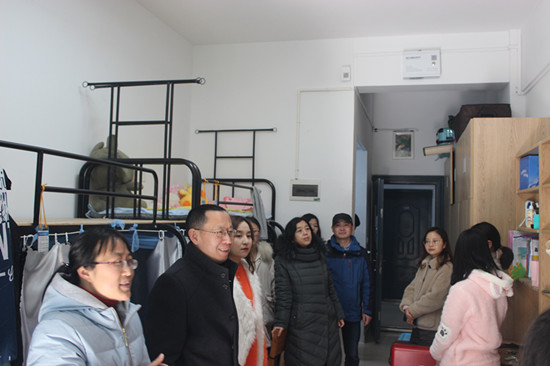新学期开始,为了切实了解同学们的返校情况,深入掌握同学们的思想动态,2月24日上午,经济管理学院党总支书记陈林杰带领全体辅导员以及学生干部代表深入到雪松苑1-2栋、雪松苑3栋、梧桐苑1-2栋、海棠苑1-2栋、筠竹苑2栋的学生宿舍进行走访。