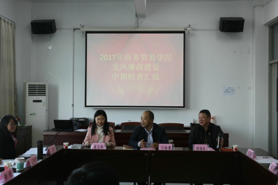 商贸学院党总支书记张啸宇进行了工作汇报:一是汇报了学院2017年党风廉政建设工作的主要思路和具体做法;二是对学院党风廉政建设中存在的不足和下一步打算做了分析、谈了想法。