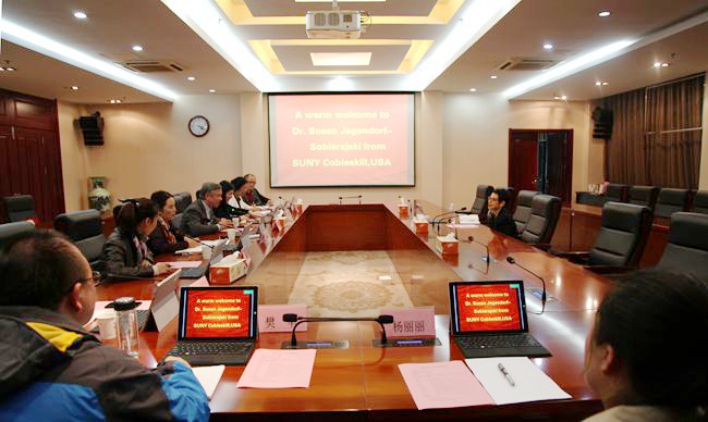 10月23日,美国纽约州立大学科贝尔斯基尔学院国际部主任苏珊女士(Ms.Susan Jagendorf-Sobierajski)来必赢官网访问,总督学卢兵热情接待了客人,双方就两校合作事宜进行了洽谈。国际合作与交流处、国际教育学院、商务贸易学院相关负责同志和团队老师参加了接待。