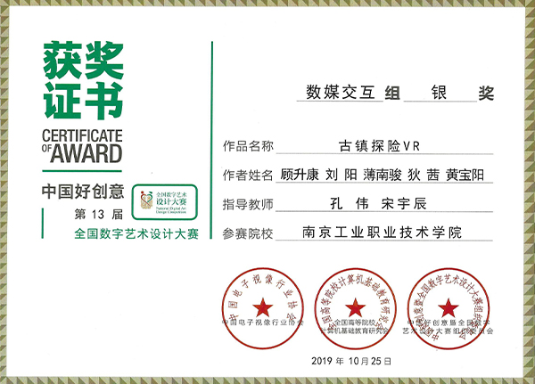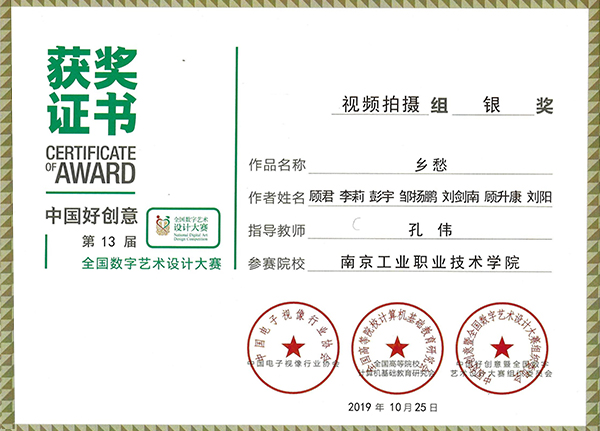 艺术设计学院组织参加的第十三届“全国数字艺术设计大赛”是年初教务处立项的校外大学生竞赛项目,已经连续参加了9届,提高了老师和学生的专业水平。其中,孔伟和宋宇辰老师指导的数媒1711班刘阳、顾升康等多位同学制作的作品《乡愁》和《古镇探险》分别获得视频拍摄组银奖和数媒交互组银奖(奖金共16000元);学术组由叶中亮老师获得银奖一项、钱海月和任小飞老师获铜奖两项。此外孔伟教授获优秀指导教师奖,同时被聘为中国电子视像行业协会数字影像创意委员会高级专家,并作为嘉宾为获奖学生颁奖。