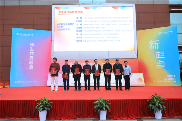中国工艺美术大师、世界非物质文化遗产南京云锦国家级传承人金文,江苏省书法家协会副主席、南京财经大学中国书画艺术研究所所长仇高驰教授,原光明日报社副社长、副总编,教育部中国人生科学学会副会长、国家一级美术师王林教授,南京师范大学美术学院绘画系主任吴维佳教授,中国绘画艺术研究院副院长、国家一级美术师、北京黄埔大学艺术学院黄亚伟教授,江苏省青年美术家协会副会长、江苏省民建书画院李业院长,江苏省中外文化交流协会副会长、江苏中亚书画院李江海院长,江苏晟诚环境艺术有限公司张琪玮董事长等8位艺术家为庆祝艺术设计学院师生作品联展开幕,向学院捐赠艺术作品8项,在开幕式上苏小冬为他们颁发了捐赠证书。