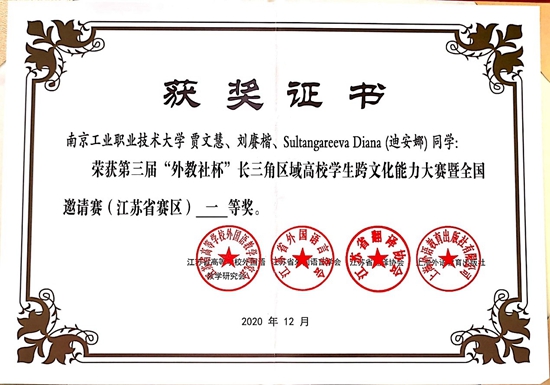 12月8日,第三届“外教社杯”长三角区域高校学生跨文化能力大赛比赛省赛评审工作在东南大学九龙湖校区举行,公共基础课部和国际教育学院选派了刘赓楷(2019级机械制造与自动化专业)、贾文慧(2020级国际贸易专业)和Sultangareeva Diana迪安娜(留(2019秋)国际贸易专业)等三名选手组成比赛团队,近日大赛结果公布并颁发证书,必赢官网学生团队喜获大赛一等奖。公共基础课部大学英语教研室张卉和国际教育学院孙世娟两位老师荣获“优秀指导教师”称号。