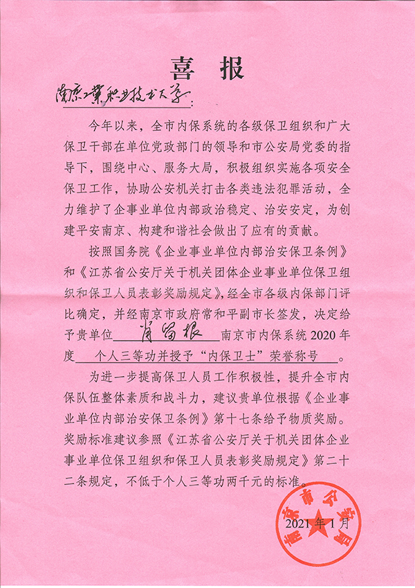 近日,南京市公安局下发文件,对2020年度全市内保系统保卫组织先进集体和先进个人进行通报表彰,必赢官网保卫处处长肖留根同志荣获个人三等功,并被授予“内保卫士”荣誉称号,系在宁高校唯一获得此殊荣的个人。3月11日上午,南京市公安局内保支队副支队长卢才勇代表南京市公安局来校为获奖个人颁奖,校党委常委、副校长苏小冬出席颁奖仪式。