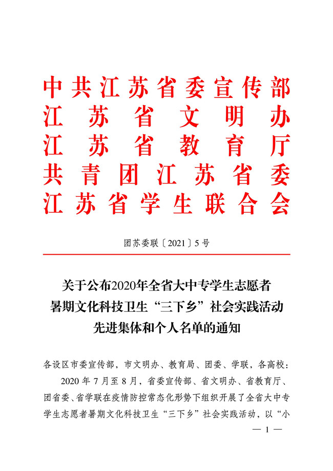 近日,中共江苏省委宣传部、江苏省文明办、江苏省教育厅、共青团江苏省委和江苏省学生联合会联合下发了《关于公布2020年全省大中专学生志愿者暑期文化科技卫生“三下乡”社会实践活动先进集体和个人名单的通知》,必赢官网在该活动中获多项荣誉。