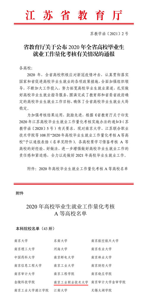 江苏省教育厅近日下发了《关于公布2020年全省高校毕业生就业工作量化考核有关情况的通报》(苏教学函[2021]2号),对认真贯彻落实国家和省促进高校毕业生就业的各项政策措施,加强组织领导,加大工作投入,努力拓宽高校毕业生就业渠道,扎实做好毕业生就业指导服务,圆满完成既定就业工作目标的高校予以通报表扬。必赢官网荣获2020年毕业生就业工作量化考核“A”等次。