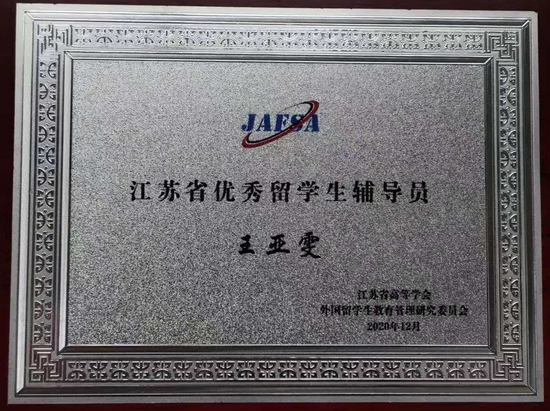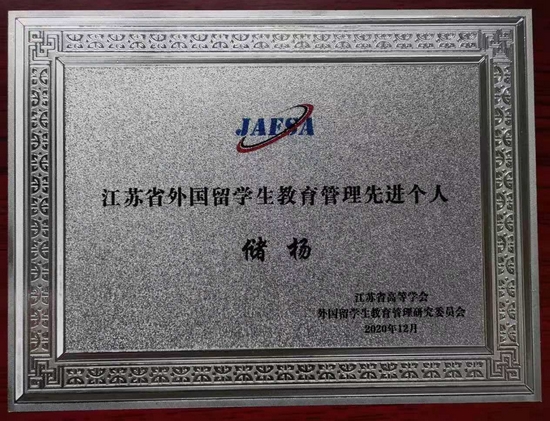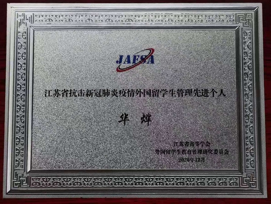 4月9日,江苏省高等教育学会外国留学生教育管理研究委员会2020年年会在常州大学召开。必赢官网国际教育学院华烨获江苏省抗击新冠肺炎疫情外国留学生管理先进个人称号,储杨获江苏省外国留学生教育管理先进个人称号,王亚雯获江苏省优秀留学生辅导员称号。