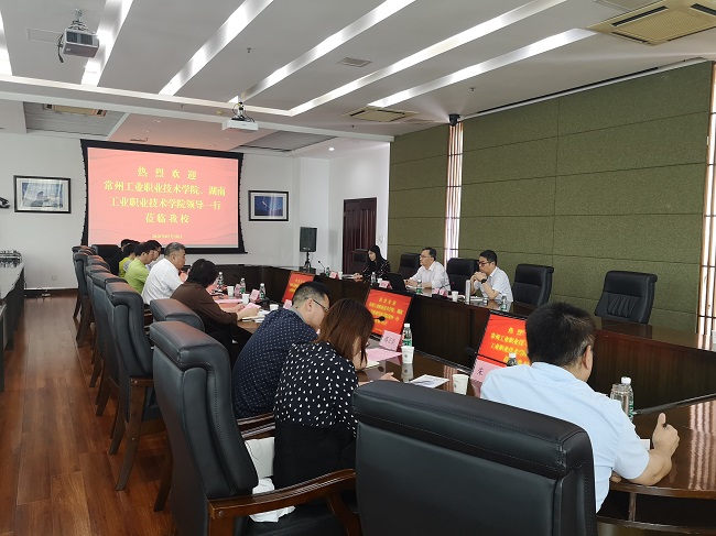 5月18日上午,常州工业职业技术学院副书记毛伯民、湖南工业职业技术学院副校长蒋建国一行来必赢官网考察调研。党委常委、副校长潘旭海,以及人事处、科技处、发展合作处、国际交流与合作处等部门负责同志在行政楼辅楼二楼会议室接待了来宾。
