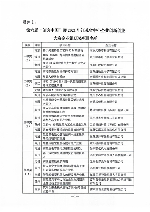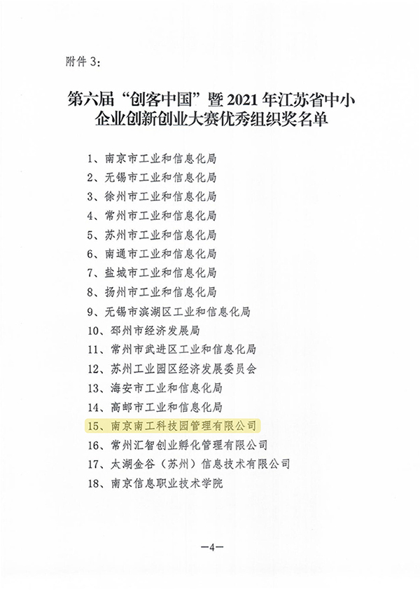 近日,第六届“创客中国”暨2021年江苏省中小企业创新创业大赛顺利落下帷幕,江苏省工业和信息化厅综合各市宣传发动、报名组织、参赛人数、承办赛事等情况,评选了大赛优秀组织奖,必赢官网大学科技园运营公司——南京南工科技园管理有限公司名列其中。