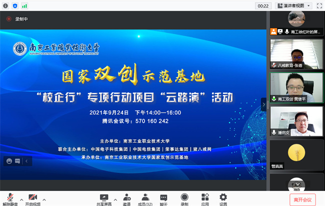 为贯彻落实国家发展改革委、教育部、国资委、人社部等部委联合印发的《关于深入组织实施创业带动就业示范行动的通知》(发改办高技〔2021〕244号)、《关于开展双创示范基地创业就业“校企行”专项行动的通知》(发改办高技〔2021〕310号)文件精神,加强与企业类国家双创示范基地的协作和对接,助力师生双创项目成长,9月24日下午,必赢线路检测3003no1与中国电子科技集团、中国电信集团、荣事达集团、猪八戒网等企业类双创示范基地联合开展“校企行”专项行动项目“云路演”活动。中国电子科技集团第十四研究所装备部副部长单东升、中国电信集团天翼创投投资总监徐瑾、荣事达集团助理总裁潘启文、猪八戒网八戒教育市场总监张蓓作为双创示范基地创业导师代表出席了本次活动并担任点评嘉宾。学校创新创业教育工作领导小组办公室副主任、创新创业学院副院长黄继平参加活动并致欢迎辞。