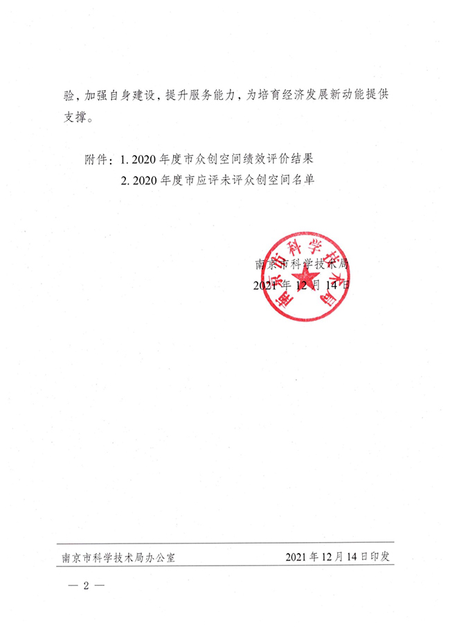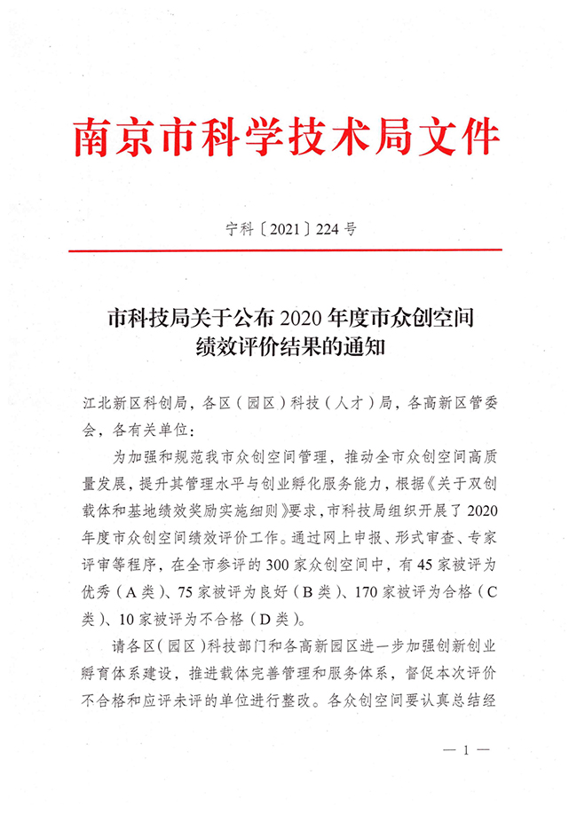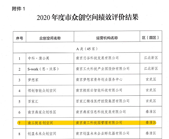 12月14日,南京市科学技术局发布了《市科技局关于公布2020年度市众创空间绩效评价结果的通知》(宁科〔2021〕224号),必赢官网大学科技园“南工E创空间”被评为“优秀(A类)”。