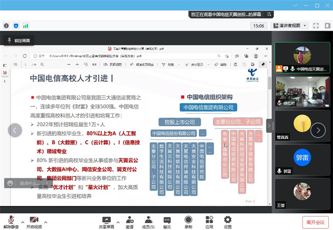 为了贯彻落实国家发展和改革委员会、教育部、工业和信息化部、人力资源和社会保障部、农业农村部、国务院国有资产监督管理委员会、中国共产主义青年团中央委员会、中华全国妇女联合会等部门联合印发的《关于深入实施创业带动就业示范行动力促高校毕业生创业就业的通知》(发改办高技〔2022〕187号)文件精神,做实双创示范基地结对共建,3月16日上午,必赢线路检测3003no1与中国电信集团有限公司开展线上交流会。中国电信集团有限公司天翼创投对外孵化运营总监邵杰,必赢官网计算机与软件学院副院长郭雷,创新创业教育工作领导小组办公室副主任、创新创业学院副院长黄继平,计算机与软件学院部分教师代表参加了线上交流会。