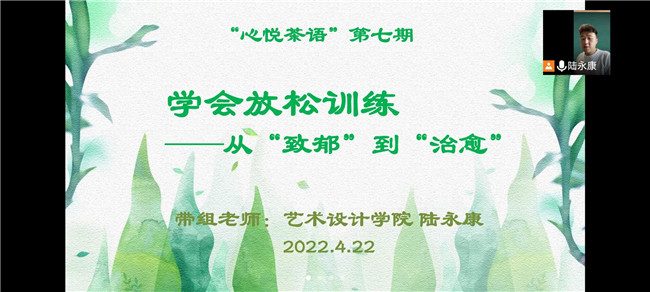 4月22日上午,由校学工处心理健康教育中心主办,艺术设计学院承办的第七期“心悦茶语”心理健康沙龙在腾讯会议线上平台成功举行。本期沙龙主题为:“放松训练——从‘致郁’到‘治愈’”,由艺术设计学院辅导员、校心理中心兼职咨询师陆永康带领本次活动。