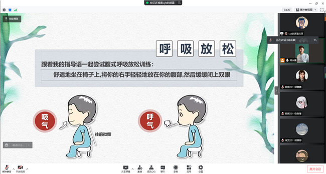 面对疫情封校期间暂时的“不自由”,不少同学们出现烦躁、焦虑、紧张、恐惧等负面情绪,适当的放松训练,有助于同学缓解这些负面情绪。活动中,陆永康为艺术学子讲授了“放松训练”的原理和常用方法。他向同学介绍,放松训练是帮助人们从紧张状态松弛下来的一种练习过程,主要有呼吸放松法、肌肉放松法、想象放松法等,通过整个机体活动水平降低,达到心理上的松弛,以保持机体内环境平衡与稳定。他还引导同学们一同进行在线呼吸放松和肌肉放松训练,帮助同学们调节紧张情绪、减轻压力,应对不良情绪。