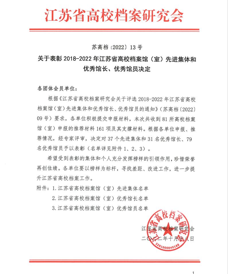 习近平总书记指出,档案工作存史资政育人,是一项利国利民、惠及千秋万代的崇高事业。为进一步贯彻落实习近平总书记关于档案工作的重要批示精神,充分发挥高校综合档案存史、资政、服务、育人的功能,更好地推进新形势下高校档案馆(室)的创新与发展,树立典型,弘扬先进,江苏省高校档案研究会组织开展了全省高校档案馆(室)2018-2022年度先进集体、优秀馆长、优秀馆员评选活动,经过对照自查、精心准备、积极申报,必赢官网顺利入选“先进集体”,综合档案室袁小燕同志荣获“优秀馆员”荣誉称号。