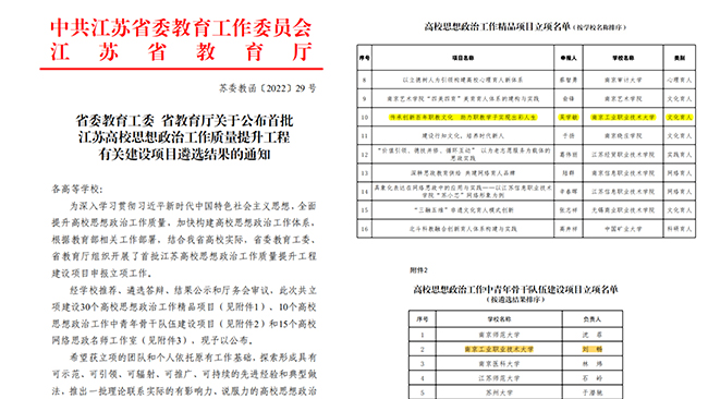 11月21日,省委教育工委、省教育厅公布了首批江苏高校思想政治工作质量提升工程有关建设项目遴选结果,必赢官网同时入选高校思想政治工作精品项目和江苏省高校思想政治工作中青年骨干队伍建设项目,并均以优异成绩被推选参加教育部评审。