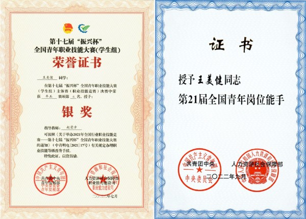 何延辉老师2020年获“五轴联动技术加工”赛项教师组一等奖,被授予“全国技术能手”荣誉称号;王美健同学2022年被共青团中央、人力资源和社会保障部联合授予“全国青年岗位能手”称号;胡道春老师获批2022年省职业教育精密制造技术“双师型”名师工作室;于鹏老师获2022年“智能制造与建造安全能力测评竞赛—工业机器人应用安全能力竞赛”教师组一等奖,被授予“江苏省技术能手”荣誉称号。
