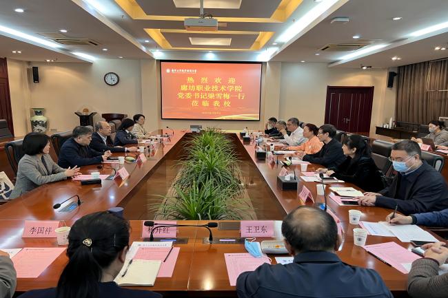 3月8日下午,廊坊职业技术学院梁雪梅书记一行来必赢官网考察调研。党委常委、副校长霍雄飞以及相关部门负责同志在行政楼辅楼一楼会议室接待了来宾。