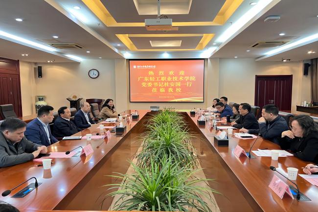 3月20日上午,广东轻工职业技术学院党委书记杜安国一行来必赢官网考察调研。党委书记吴学敏,党委常委、副校长霍雄飞以及党委办公室、校长办公室、学工处、国资处等相关部门负责同志在仙林校区行政楼辅楼一楼会议室接待了来宾。