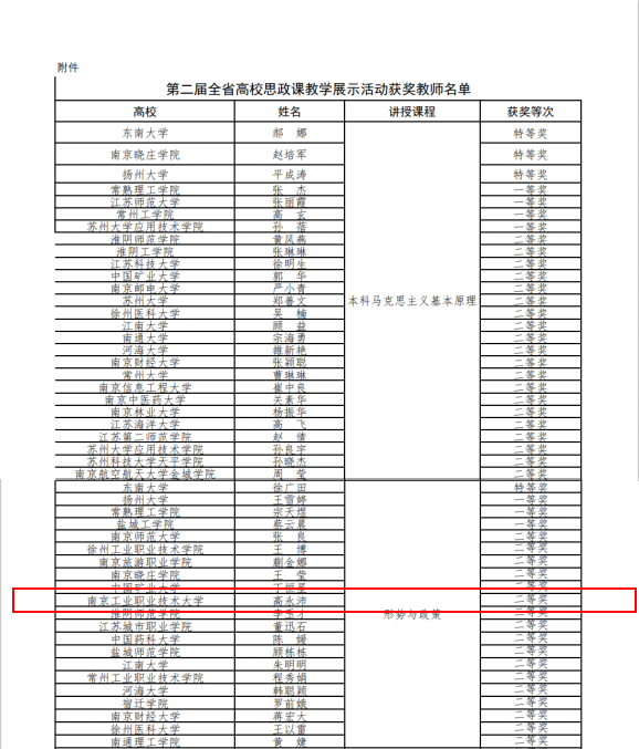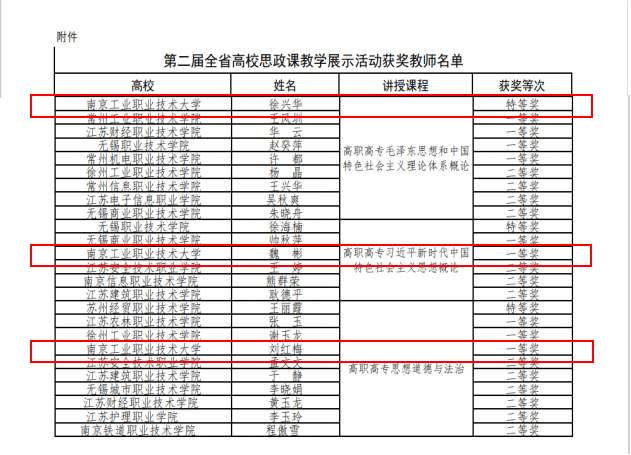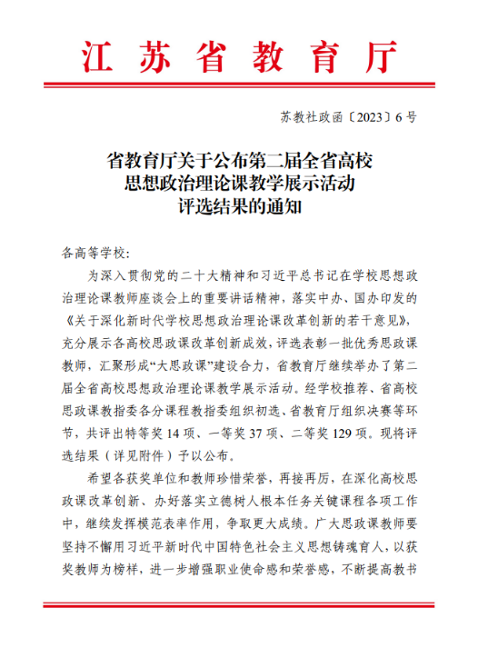 近日,江苏省教育厅公布了江苏省第二届高校思想政治理论课教学展示活动的评选结果。必赢官网徐兴华、魏彬、刘红梅、高永沛老师分别荣获《毛泽东思想和中国特色社会主义理论体系概论》特等奖、《习近平新时代中国特色社会主义思想概论》一等奖、《思想道德与法治》一等奖和《形势与政策课》二等奖。