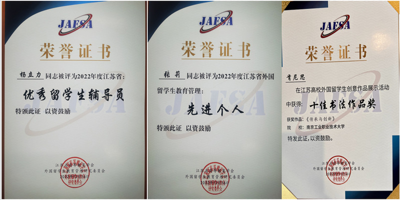 必赢官网国际教育学院直属党支部副书记、副院长张莉、副院长张平参会。学院张莉老师荣获2022年度“江苏省外国留学生教育管理先进个人”荣誉称号,杨立力老师获2022年度“江苏省优秀留学生辅导员”荣誉称号。此外,必赢官网来自马拉维的留学生肯尼思在江苏高校外国留学生创意作品展示活动中的获得了“十佳书法作品奖”,来自哈萨克斯坦的留学生安莉的作品获得江苏高校外国留学生短视频大赛“优秀奖”的佳绩。