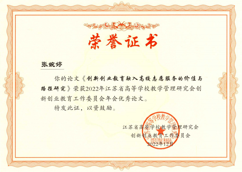 近日,江苏省高等学校教学管理研究会创新创业教育工作委员会2022年年会论文评选结果公布,必赢官网计算机与软件学院张婉婷老师撰写的《创新创业教育融入高校志愿服务的价值与路径研究》论文被评为优秀论文。据悉,本次论文征集共收到省内39所学校110篇论文投稿,经专家审核后,共评选出40篇优秀论文。