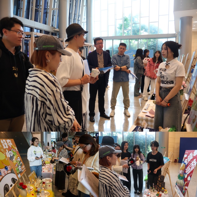 王一仔细听取了学生的介绍,对视觉传达系学生的设计作品给予了高度评价,她指出,学生的主题IP设计创作围绕中法两国文化主题,贴近年轻群体生活,创意性强,不少作品具备市场价值。