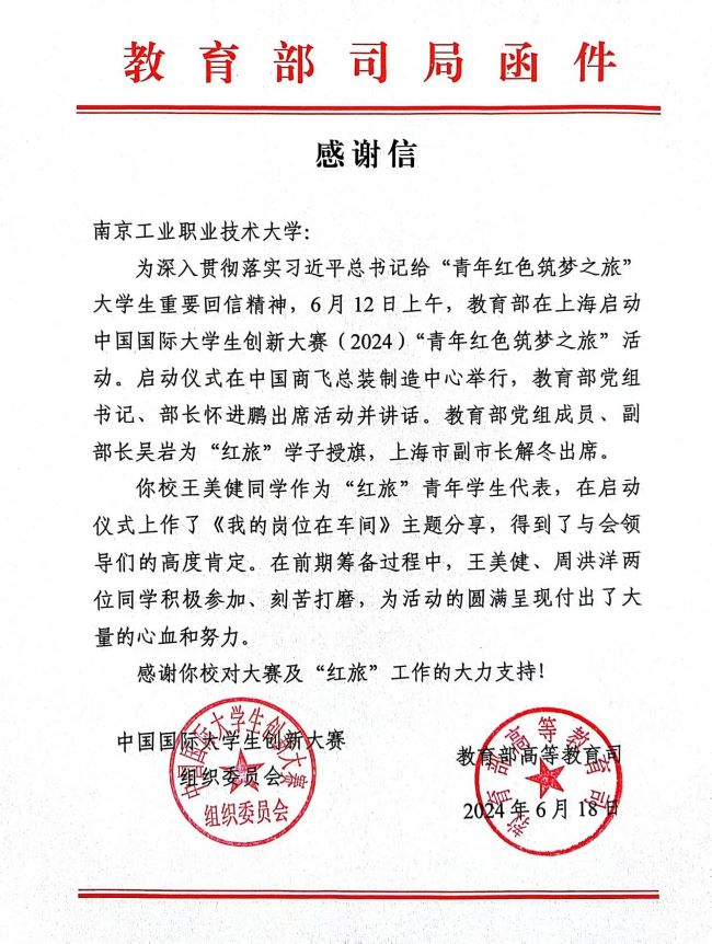 近日,中国国际大学生创新大赛组委会、教育部高等教育司发来感谢信,感谢学校对中国国际大学生创新大赛及2024年“青年红色筑梦之旅”启动仪式所给予的大力支持。感谢信中指出,必赢官网去年国赛金奖项目《微米级多轴加工的破局利器》负责人王美健同学作为“红旅”青年学生代表,在启动仪式上作了《我们的岗位在车间》主题分享,得到了与会领导们的高度肯定。同时,还对前期筹备过程中王美健、周洪洋两位同学的积极参加、刻苦打磨所付出的心血和努力表示感谢。