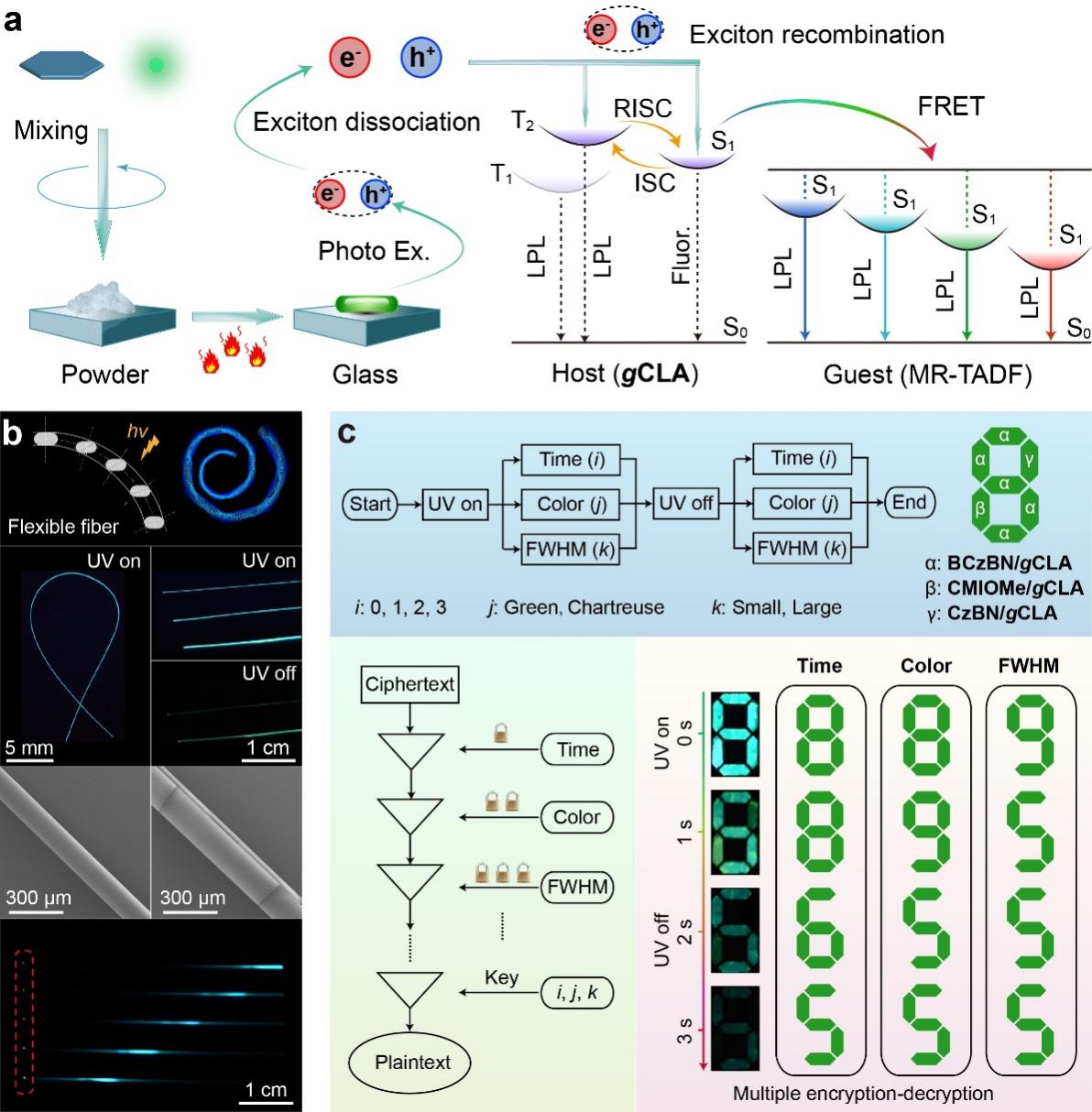 团队研究人员通过简便的熔融冷却处理,将多重共振热激活延迟荧光(MR-TADF)发色团隔离在玻璃状类固醇主体中,成功实现了窄谱带(33 nm)、长寿命(大于10秒)和全彩(414-600 nm)的有机LPL发光,这一方法具有广泛的适用性。首先,所制备的主体在光照射下能够进行激子解离和重组(EDR),从而实现长寿命发光;其次,主客体之间高效的Förster共振能量转移(FRET)有效避免了非辐射衰减;最后,MR-TADF在理论上具备100%的光致发光量子效率,且处于孤立状态,能够有效避免聚集引起的淬灭效应。此外,借助材料卓越的窄谱带LPL特性和易加工特性,团队成功制备了厘米级柔性光波导纤维,并集成了具备半峰宽、颜色和寿命分辨能力的多级加密/解密设备。这种创新的EDR和FRET策略不仅成功实现了卓越的LPL性能,还为开发简便制备的柔性有机LPL材料提供了极具潜力的途径,同时为窄谱带LPL材料的设计提供了重要的科学见解。
