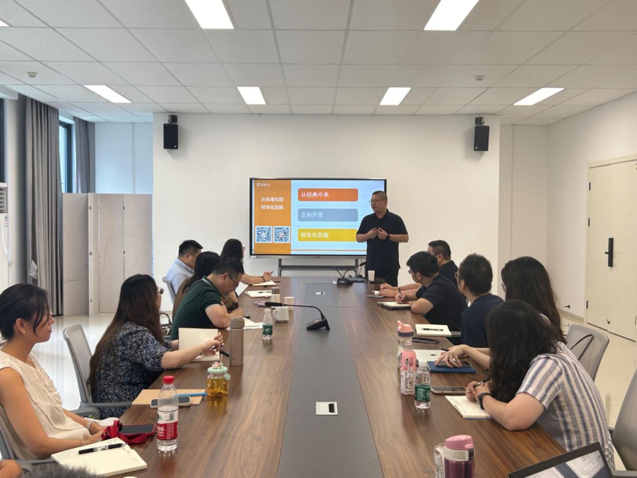 曹兰以《基于职业院校教学能力比赛的创新型职业院校教学共同体建设》为主题,从创新型教学共同体的政策引领、创新型教学共同体的理论依据和创新型教学共同体的实践案例——教学能力比赛三个方面生动讲解了职业院校如何建设创新型教学共同体。钱静峰作了《易米实验室课程建设实证与案例》主题讲座,向教师们展示了课程建设从标准化到校本化的实践,介绍了如何展开课程正向设计,并以《探索心仪的专业》(高职版)和交大生涯规划校本课程为例,展示了课程建设和实施的具体做法。讲座结束后,钱静峰还与张宝玲还分别就学院《职业生涯规划》和《就业指导》两门课程的建设进行了深入详细的指导,和相关教师进行了热烈交流,针对性解答了建设过程中的一些问题,有力推进了课程设计的更新迭代和数字化教学资源的开发。