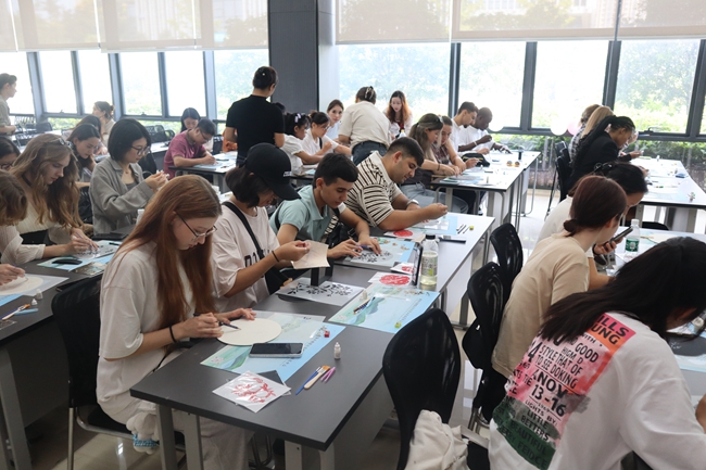 本次活动的重头戏是非遗烧箔画制作体验。烧箔画是起源于唐代的非遗技艺,使用金属箔片加热后附着在器物上形成装饰效果,距今已有一千多年的历史,被列入第二批国家非物质文化遗产名录。为了凸显“中秋”元素,烧箔画的附着载体选择了团扇,取“团圆”寓意。非遗传承人钱秋伟老师为中外师生现场演示了非遗烧箔画的制作技艺和基本步骤,“以墨为骨,勾勒万物之形;胶水为桥,联结古今之情;金箔添彩,尽显璀璨之辉……”随后,在老师的指导下,留学生们勾勒线条、涂抹胶水、贴附金箔、刷掸赋形、品物题字,将古风意境、思念情怀融入团扇中。随着工序的不断深入,一幅幅绚烂的创意金箔画跃然纸上,原本单调的扇面在金箔的点缀下变得烁金流光。作品完成后,留学生们纷纷自豪展示,与家人和朋友分享“此时此刻”。